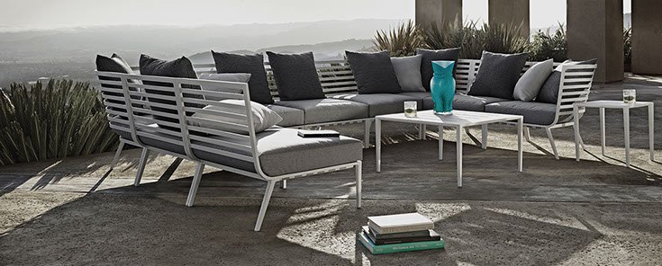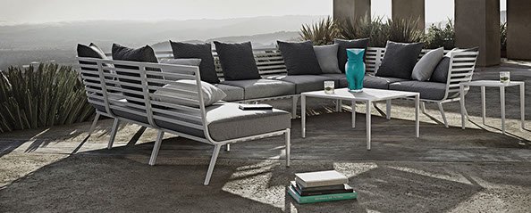 Inspired by the sleek yachts of the French Riviera, the Vista outdoor lounge collection features strong horizontal lines formed into flowing, curved shapes, creating a visually light, yet welcoming form.