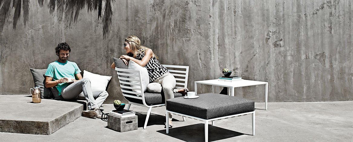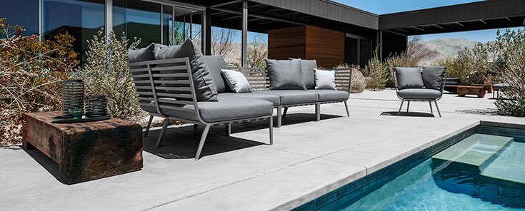 Inspired by the sleek yachts of the French Riviera, the Vista outdoor lounge collection features strong horizontal lines formed into flowing, curved shapes, creating a visually light, yet welcoming form.